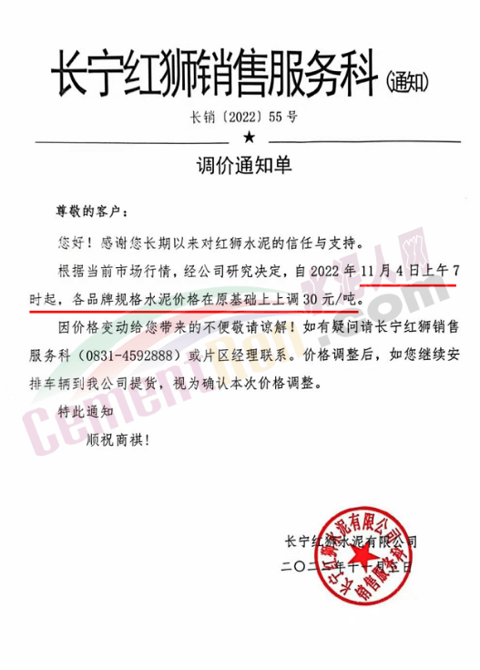 長寧紅獅銷售服務科通知,根據(jù)當前市場行情,經(jīng)公司研究決定,自2022年11月4日上午7 時起,各品牌規(guī)格水泥價格在原基礎上上調30元/噸。