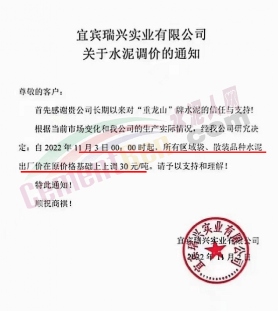 宜興實業(yè)有限公司通知,根據(jù)當前市場變化和公司的生產(chǎn)實際情況,經(jīng)公司研究決定自2022年11月3日0時起,所有區(qū)域袋、散裝品種水泥出廠價在原價格基礎上上調30元/噸。