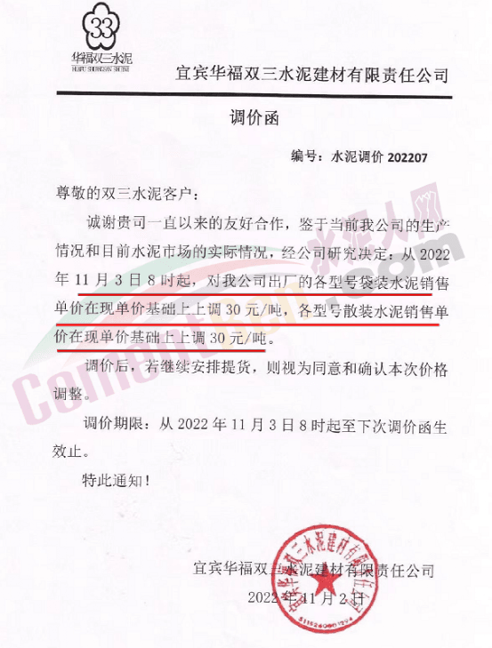 宜賓華福雙三水泥建材有限責任公司通知,11月3日8時起,公司各品種水泥上調30元/噸。