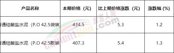 2022年10月下旬流通領域重要生產(chǎn)資料市場價格變動情況顯示,普通硅酸鹽水泥(P.O 42.5袋裝)報價434.5元/噸,上漲5.3元/噸;普通硅酸鹽水泥(P.O 42.5散裝)407.3元/噸,上漲5.4元/噸,漲幅1.2%~1.3%,水泥價格已突破400元/噸大關。