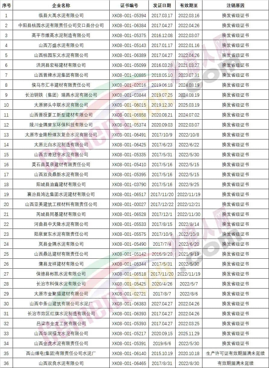 山西省共注銷36家水泥企業(yè)生產(chǎn)許可證,其中34家為換發(fā)省級(jí)下書,一家為有效期屆滿未延續(xù),一家為山西省市場(chǎng)監(jiān)管局公告注銷;