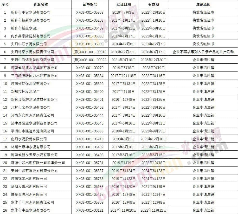 湖南省20家企業(yè)生產(chǎn)許可證注銷,16家水泥企業(yè)換發(fā)新編號(hào)證書,3家企業(yè)申請(qǐng)注銷,1家企業(yè)實(shí)地審查不合格;