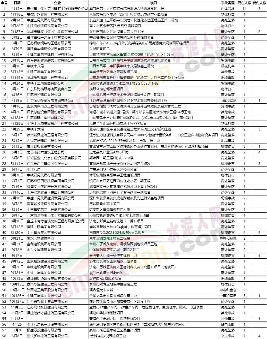 據水泥人網不完全統(tǒng)計2022年1月以來,高處墜落、機械傷害、坍塌等事故多發(fā)于在建項目工地,其中承建、總包企業(yè)不乏中建、中鐵集團公司等公司旗下企業(yè)。