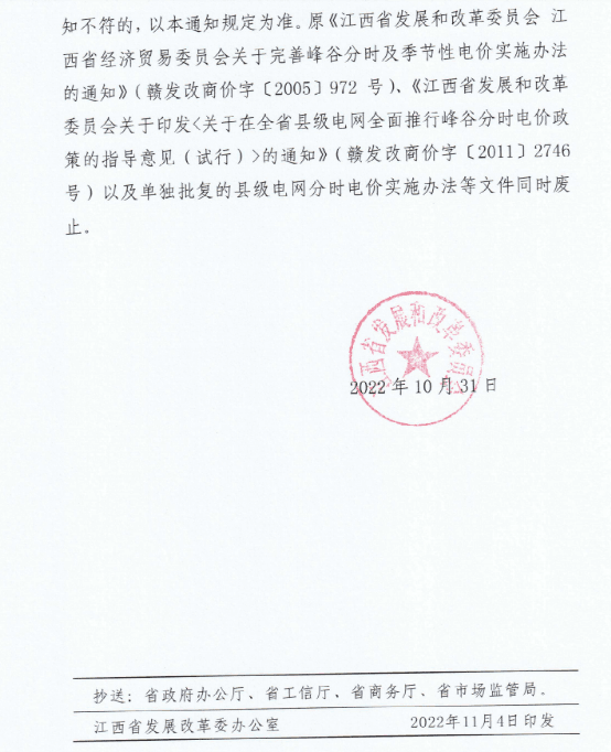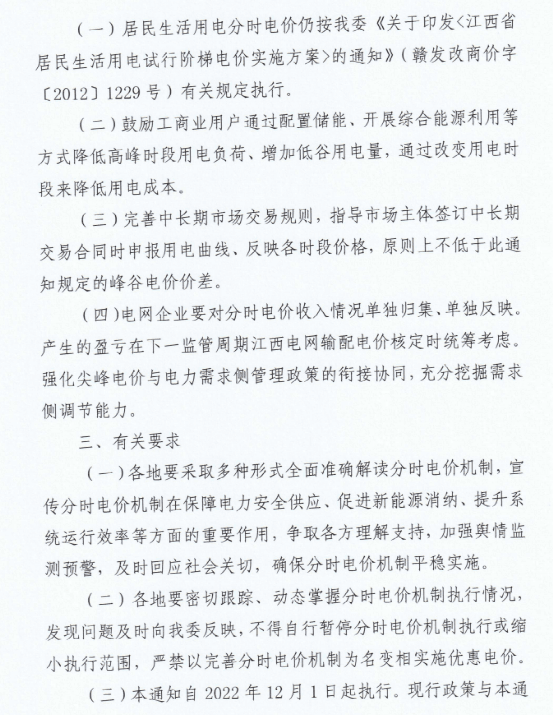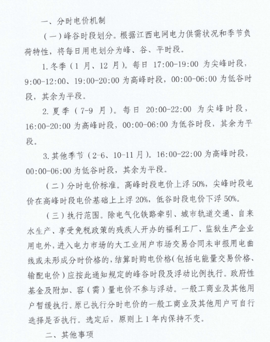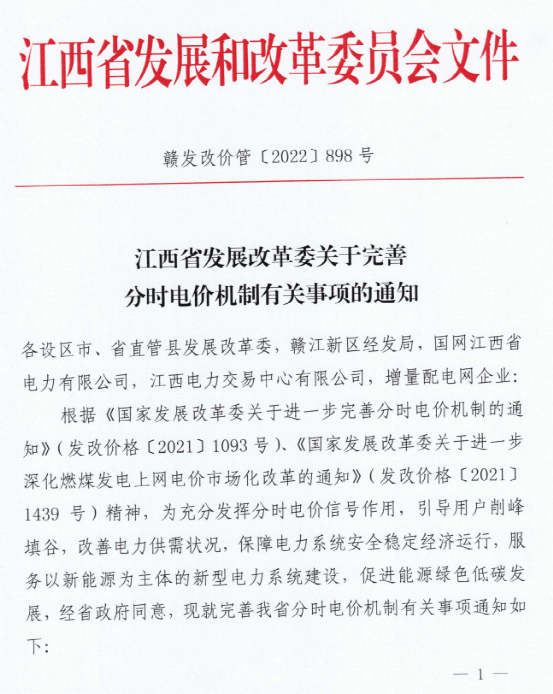 江西省公布了《關(guān)于完善分時(shí)電價(jià)機(jī)制有關(guān)事項(xiàng)的通知》要求自2022年12月1日起在全省統(tǒng)一執(zhí)行。此次完善分時(shí)電價(jià)機(jī)制執(zhí)行范圍為大工業(yè)用戶。
