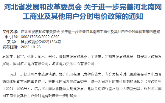 10月28日,河北省發(fā)改委發(fā)布《關(guān)于進(jìn)一步完善河北南網(wǎng)工商業(yè)及其他用戶分時(shí)電價(jià)政策的通知》要求,自2022年12月1日起執(zhí)行,平段電價(jià)按市場(chǎng)交易購電價(jià)格或電網(wǎng)代理購電平均上網(wǎng)價(jià)格執(zhí)行,高峰和低谷時(shí)段用電價(jià)格在平段電價(jià)基礎(chǔ)上分別上下浮動(dòng)70%;尖峰時(shí)段用電價(jià)格在高峰電價(jià)基礎(chǔ)上上浮20%。