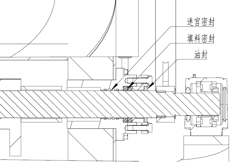 針對上述問題,HJ新型翻板閥設(shè)計思路是將密封和轉(zhuǎn)動兩個相互矛盾問題拆開后分別處理。由內(nèi)而外設(shè)置迷宮、填料、油封三層密封結(jié)構(gòu)(見圖3)。其中迷宮、油封結(jié)構(gòu)不直接與轉(zhuǎn)動軸接觸,迷宮結(jié)構(gòu)內(nèi)部設(shè)置引流環(huán),可提前大幅度卸去沖擊到填料上面的瞬時正壓,由于接觸填料的瞬時正壓變低,填料密封的效果更加顯著。設(shè)置在最外端的油封既可以減少外部粉塵進(jìn)入填料,也可以再次降低漏料幾率。