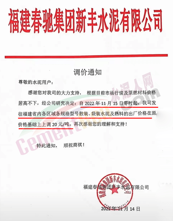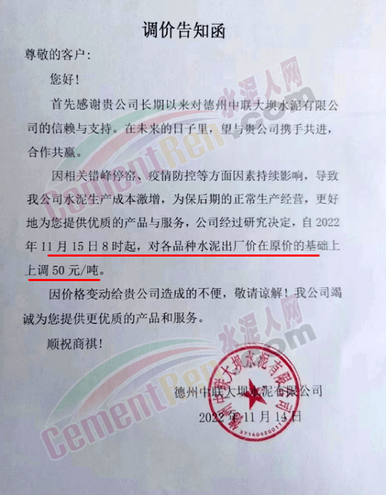 山東區(qū)域近來正處于一輪調價過程,區(qū)域內(nèi)主要品牌企業(yè)通知上調水泥價格。山東德州大壩中聯(lián)水泥通知稱,因相關錯峰停窯、疫情防控等方面因素持續(xù)影響,導致公司水泥生產(chǎn)成本激增,為保后期的正常生產(chǎn)經(jīng)營,經(jīng)過研究決定,自2022 年11月15日8時起,對各品種水泥出廠價在原價的基礎上上調50元/噸。