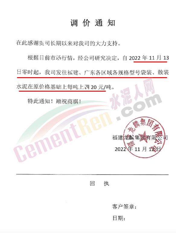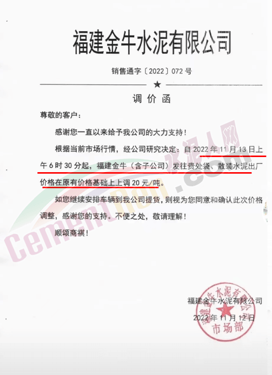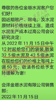 會澤金塬水泥有限公司銷售部通知,因近期限產(chǎn)、限電,及水泥原材料價格繼續(xù)上漲,造成水泥生產(chǎn)成本過高公司會議研究決定從2022年11月15日中午12時起給您們的袋裝,散裝32.5級水泥及42.5級水泥價格上調50元/噸。