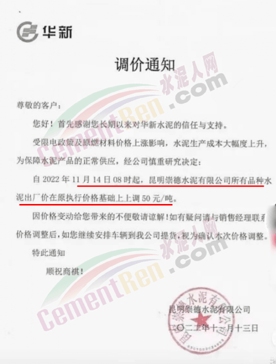 昆明崇德水泥有限公司通知,自11月14日8時起所有品種水泥出廠價上調50元/噸。
