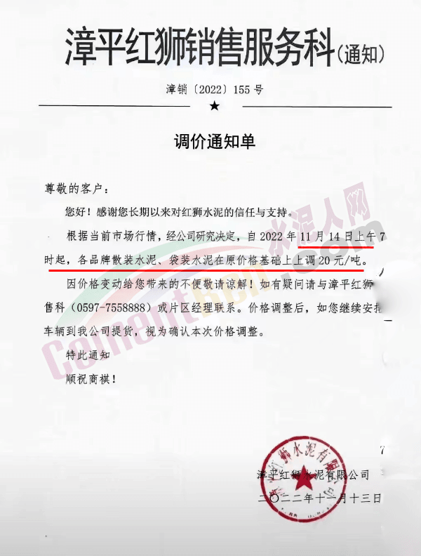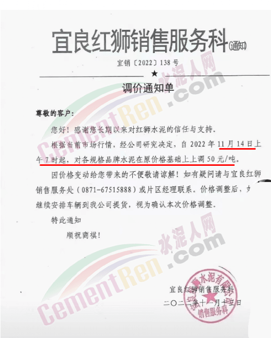 宜良紅獅銷售服務科通知,11月14日上午7時起,各規(guī)格品牌水泥在原價基礎上上調50元/噸。