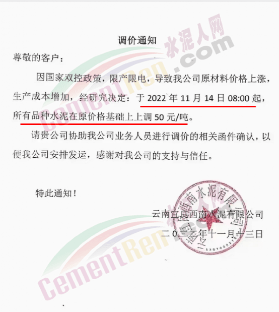 云南宜良西南水泥有限公司通知,因國家雙控政策,限產(chǎn)限電,導致公司原材料價格上漲,生產(chǎn)成本增加,經(jīng)研究決定自11月14日8時起,所有品種水泥價格上調50元/噸。