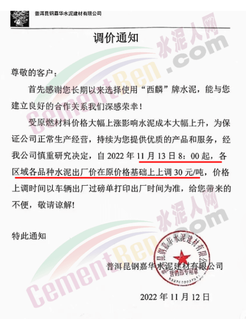 普洱昆鋼嘉華水泥建材有限公司通知,自11月13日8時起,各區(qū)域各品種水泥出廠價上調30元/噸。