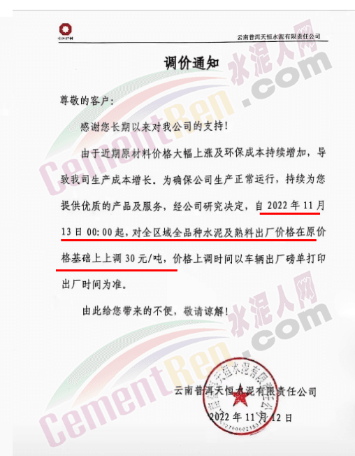 云南普洱天恒水泥有限責任公司通知,11月13日0時起,對全區(qū)域全品種水泥及熟料出廠價在原價基礎上上調30元/噸。
