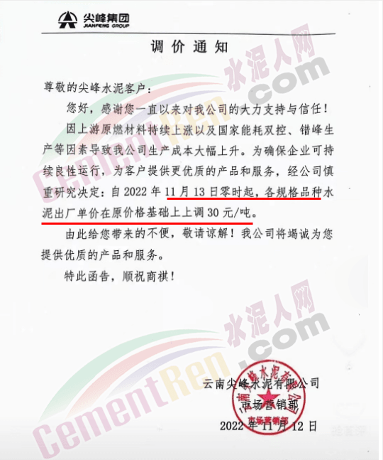 云南尖峰水泥有限公司市場營銷部通知,11月13日零時起,各規(guī)格品種水泥出廠單價在原價基礎上上調30元/噸。