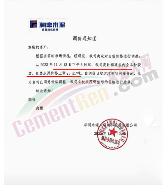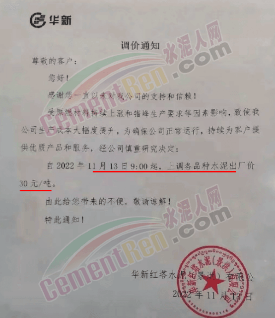 華新紅塔水泥(景洪)有限公司通知,自11月13日9時起,上調各品種水泥出廠價30元/噸。