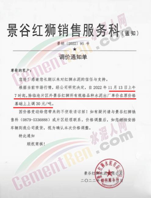 景谷紅獅水泥銷售服務科通知,11月13日 上午7時起,除臨滄片區(qū)外景谷紅獅所有規(guī)格品種水泥出廠價上調30元/噸。