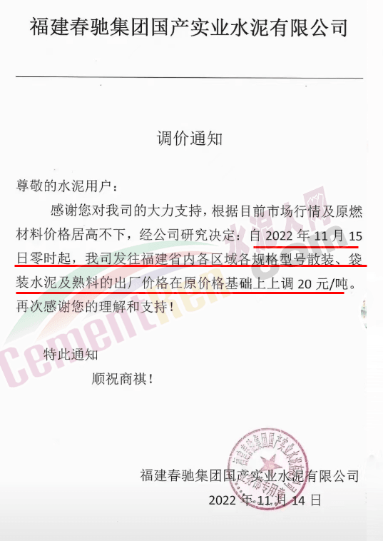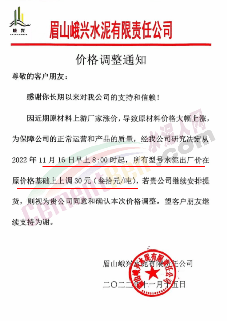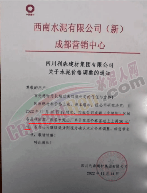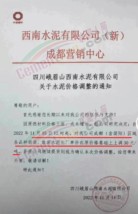 與此同時,區(qū)域內(nèi)主要品牌企業(yè)通知稱,因原燃材料價格上漲,成本增加,經(jīng)研究決定成都(含簡陽)區(qū)域水泥價格上調30元/噸。