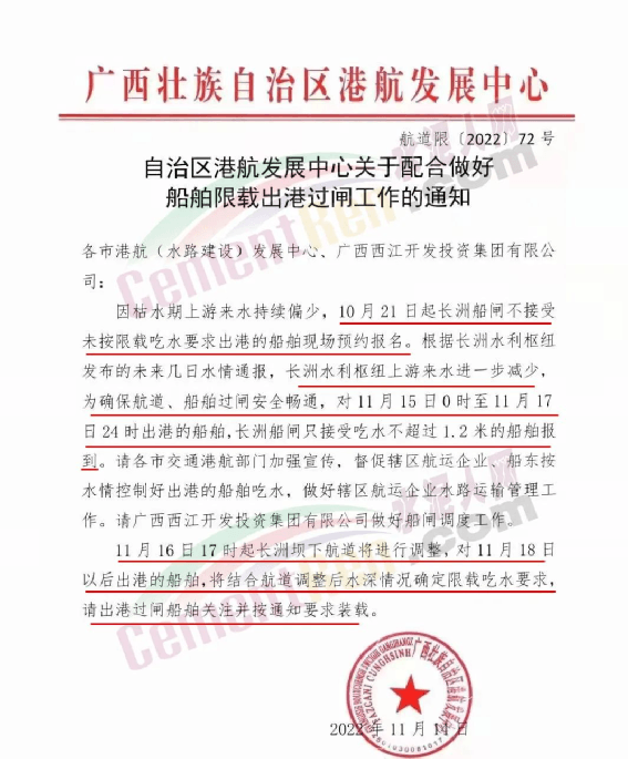 根據(jù)長洲水利樞紐發(fā)布的未來幾日水情通報,長洲水利樞紐上游來水進一步減少,為確保航道、船舶過閘安全暢通,對11月15日0時至11月17 日24時出港的船舶,長洲船閘只接受吃水不超過1.2米的船舶報到。11月16日17時起長洲壩下航道將進行調整,對11月18日以后出港的船舶,將結合航道調整后水深情況確定限載吃水要求,請出港過閘船舶關注并按通知要求裝載。