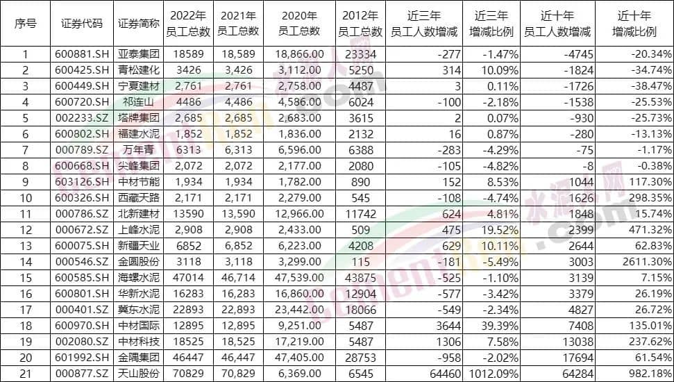 水泥行業(yè)A股21家上市公司數(shù)據(jù)可見,近3年來(lái)有10家企業(yè)出現(xiàn)不同幅度的減員,其中金隅集團(tuán)958人,華新水泥、海螺水泥減員也都在500人以上。