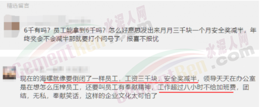 今年6月下旬,海螺水泥對(duì)于網(wǎng)傳“海螺裁員”消息辟謠稱,不可能裁員,效益不好的工廠部分能力強(qiáng)的員工會(huì)調(diào)崗到集團(tuán)內(nèi)另外的企業(yè)。之后又傳出海螺水泥安全獎(jiǎng)減半的消息,且有通知稱,若企業(yè)出現(xiàn)虧損,年金也將取消。