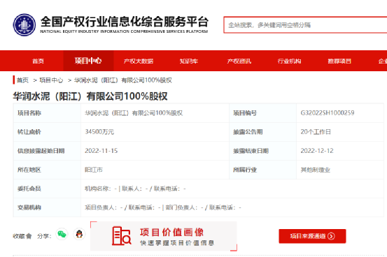 11月15日,全國產(chǎn)權(quán)行業(yè)信息化綜合服務平臺披露華潤水泥控股(香港)有限公司(以下簡稱“華潤水泥控股(香港)”)掛牌轉(zhuǎn)讓華潤水泥(陽江)有限公司(以下簡稱“華潤水泥(陽江)”)100%股權(quán),轉(zhuǎn)讓底價3.45億元,信息披露起止日為2022年11月15日至2022年12月12日。