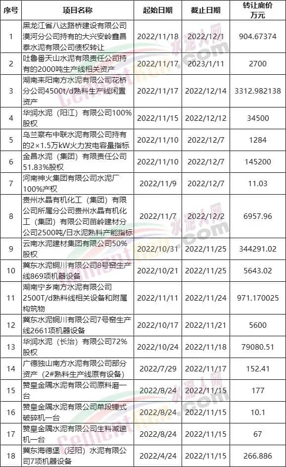 據(jù)水泥人網(wǎng)不完全統(tǒng)計,全國產(chǎn)權(quán)行業(yè)信息化綜合服務平臺正在披露項目中包含18個水泥行業(yè)出讓項目。出讓標的分別為股權(quán)、產(chǎn)權(quán)、資產(chǎn)、熟料指標、火力發(fā)電容量指標、生產(chǎn)設備以及附屬構(gòu)筑物等。涉及企業(yè)包括國內(nèi)主要品牌水漲企業(yè)華潤水泥、南方水泥、中聯(lián)水泥、金隅冀東等。