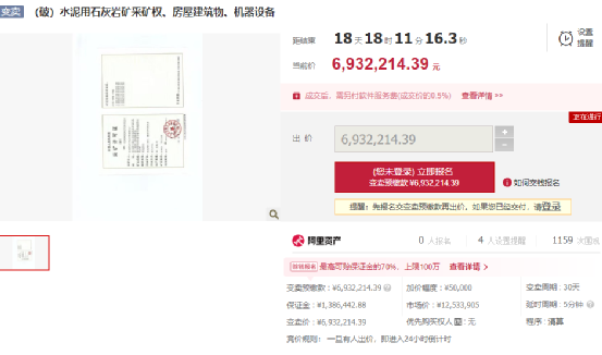 本次變賣標的所指的標的物,房屋建筑物、構(gòu)筑物及其他輔助設施、機器設備評估價值為301.49萬元,水泥用石灰?guī)r礦采礦權(quán)評估咨詢價值為865.14萬元,采礦權(quán)資源價款為86.7605萬元,合計1253.3905萬元。