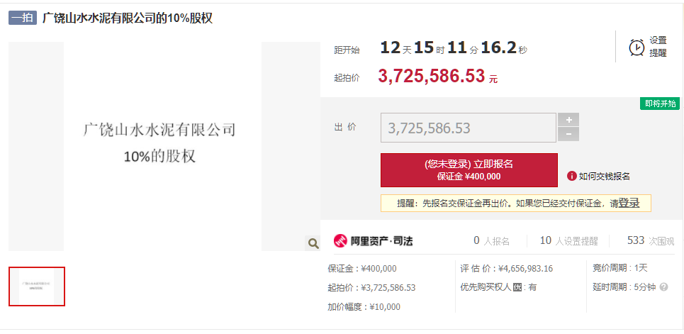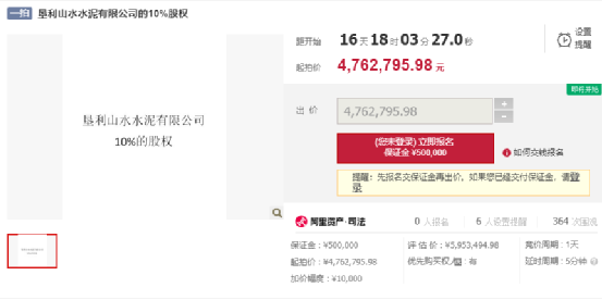 拍賣對象為勝利油田營海實業(yè)集團有限公司所持有的在廣饒山水水泥有限公司的10%股權(quán)。評估價:4656983.16元,起拍價:3725586.53元,保證金:400000元,增價幅度:10000元。