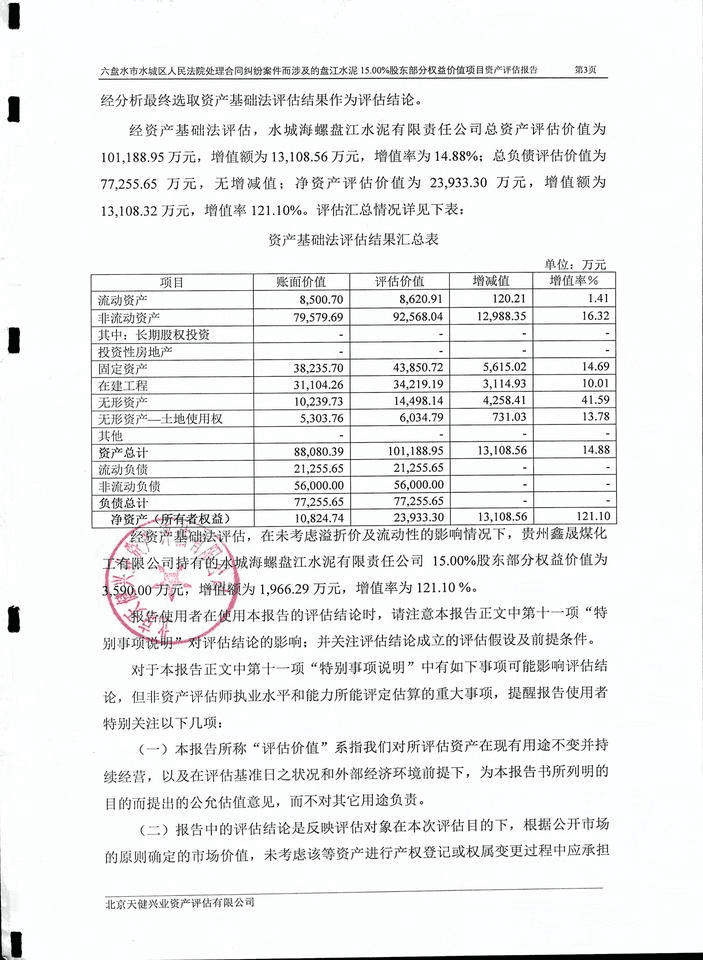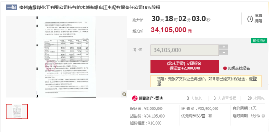 拍賣標的為被執(zhí)行人貴州鑫晟煤化工有限公司持有的水城海螺盤江水泥有限責任公司15%股權(quán)。起拍價:3410.5萬元,保證金:200萬元,增價幅度:10000元。