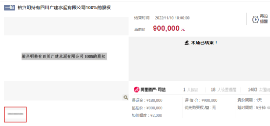 水泥人網(wǎng)注意到于11月10日10時結(jié)束的“柏興明持有四川廣建水泥有限公司100%的股權(quán)”公開拍賣,當前價為90萬元。