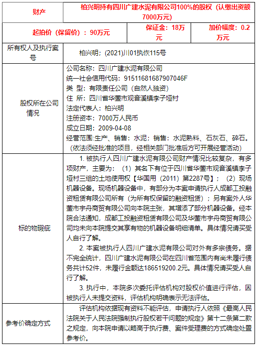 四川省成都市中級人民法院發(fā)布的公告文件中提到,拍賣標的“興明持有四川廣建水泥有限公司100%的股權(quán)”為涉案財產(chǎn),起拍價為90萬元。