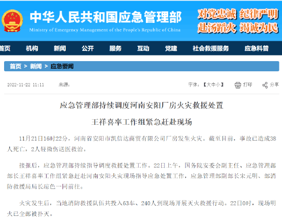 11月21日16時22分,河南省安陽市文峰區(qū)(高新區(qū))寶蓮寺鎮(zhèn)平原路凱信達商貿(mào)有限公司發(fā)生火災(zāi)。據(jù)應(yīng)急管理部消息,截至11月22日11時,事故共造成38人死亡,89人成功逃生。