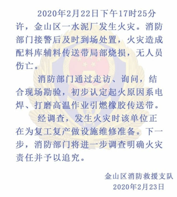 2020年2月22日下午5點25分許,上海金山區(qū)一水泥廠發(fā)生火災(zāi)。消防部門接警后及時到場處置,火災(zāi)造成配料庫輔料傳送帶局部燒損,無人員傷亡。消防部門通過走訪、詢問,結(jié)合現(xiàn)場勘驗,初步認(rèn)定起火原因系電焊、打磨高溫作業(yè)引燃橡膠傳送帶。
