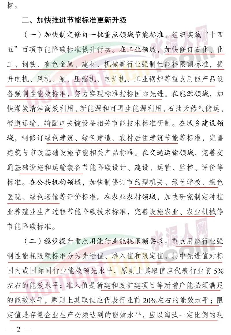 在工業(yè)領(lǐng)域,加快修訂石化、化工、鋼鐵、有色金屬、建材、機(jī)械等行業(yè)強(qiáng)制性能耗限額標(biāo)準(zhǔn),提升電機(jī)、風(fēng)機(jī)、泵、壓縮機(jī)、電焊機(jī)、工業(yè)鍋爐等重點(diǎn)用能產(chǎn)品設(shè)備強(qiáng)制性能效標(biāo)準(zhǔn),努力實(shí)現(xiàn)標(biāo)準(zhǔn)指標(biāo)國(guó)際先進(jìn)。在能源領(lǐng)域,加快煤炭清潔高效利用、新能源和可再生能源利用、石油天然氣儲(chǔ)運(yùn)、管道運(yùn)輸、輸配電關(guān)鍵設(shè)備相關(guān)節(jié)能技術(shù)標(biāo)準(zhǔn)研制。在城鄉(xiāng)建設(shè)領(lǐng)域,制修訂綠色建筑、綠色建造、農(nóng)村居住建筑節(jié)能等標(biāo)準(zhǔn),完善建筑與市政基礎(chǔ)設(shè)施節(jié)能相關(guān)產(chǎn)品標(biāo)準(zhǔn)。在交通運(yùn)輸領(lǐng)域,完善交通基礎(chǔ)設(shè)施和運(yùn)輸裝備節(jié)能降碳設(shè)計(jì)、建設(shè)、運(yùn)營(yíng)、監(jiān)控、評(píng)價(jià)等標(biāo)準(zhǔn)。在公共機(jī)構(gòu)領(lǐng)域,加快制修訂節(jié)約型機(jī)關(guān)、綠色學(xué)校、綠色醫(yī)院、綠色場(chǎng)館等評(píng)價(jià)標(biāo)準(zhǔn)。在農(nóng)業(yè)農(nóng)村領(lǐng)域,加快研究制定種植業(yè)養(yǎng)殖業(yè)生產(chǎn)過(guò)程節(jié)能降碳技術(shù)標(biāo)準(zhǔn),完善設(shè)施農(nóng)業(yè)、農(nóng)業(yè)機(jī)械等節(jié)能降碳標(biāo)準(zhǔn)。