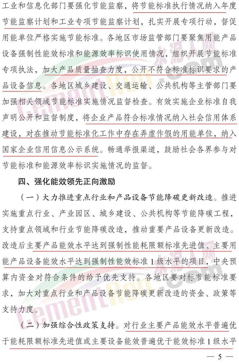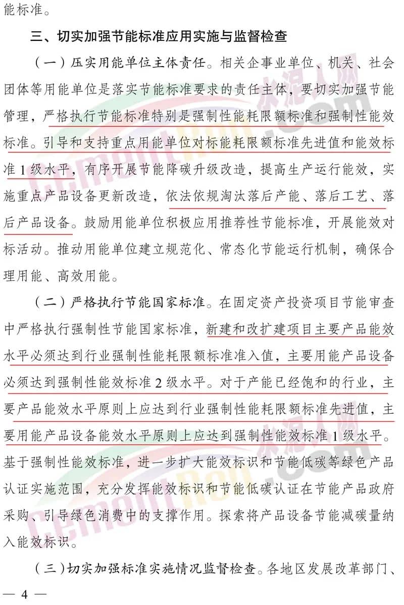 切實(shí)加強(qiáng)節(jié)能標(biāo)準(zhǔn)應(yīng)用實(shí)施與監(jiān)督檢查。壓實(shí)用能單位主體責(zé)任,引導(dǎo)和支持重點(diǎn)用能單位對(duì)標(biāo)能耗限額標(biāo)準(zhǔn)先進(jìn)值和能效標(biāo)準(zhǔn)1級(jí)水平,有序開(kāi)展節(jié)能降碳升級(jí)改造,提高生產(chǎn)運(yùn)行能效,實(shí)施重點(diǎn)產(chǎn)品設(shè)備更新改造,依法依規(guī)淘汰落后產(chǎn)能、落后工藝、落后產(chǎn)品設(shè)備。