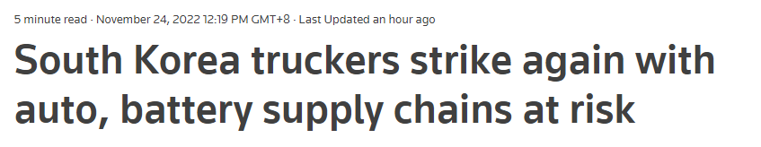 11月24日,韓國卡車司機開始罷工,他們以高油價為由,要求政府延長最低運費臨時規(guī)定,這一規(guī)定將于今年年底到期。