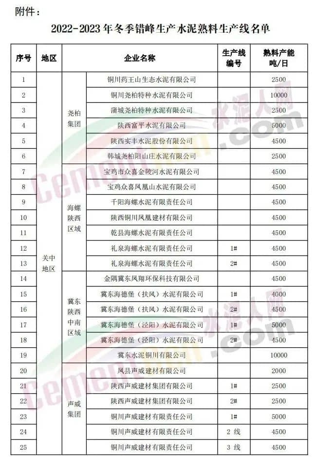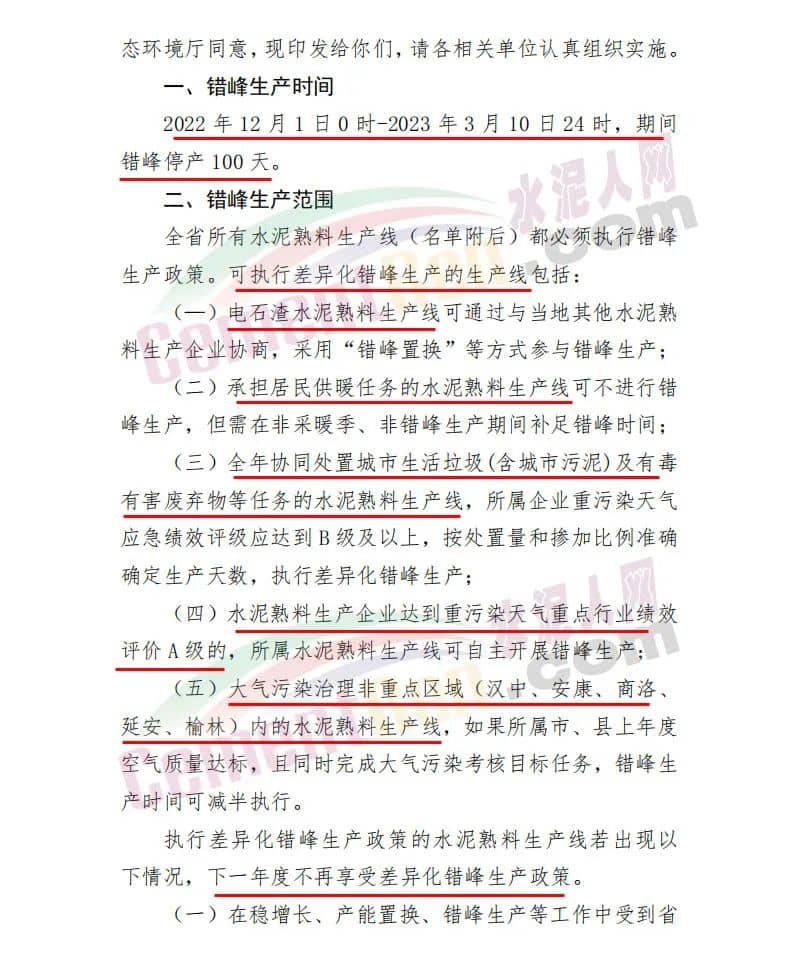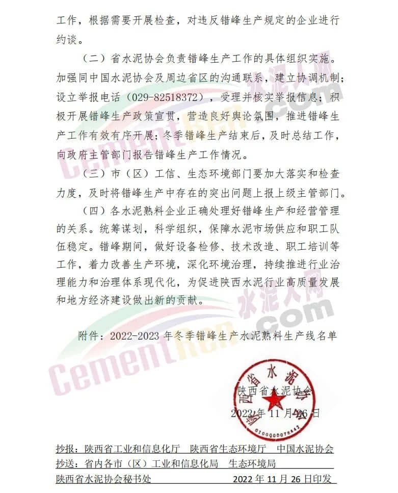 日前,陜西省水泥協(xié)會(huì)發(fā)布關(guān)于印發(fā)《陜西水泥行業(yè)2022-2023年冬季錯(cuò)峰生產(chǎn)方案》的通知,要求全省所有水泥熟料生產(chǎn)線2022年12月1日0 時(shí)-2023年3月10日24時(shí),期間錯(cuò)峰停產(chǎn)100天。