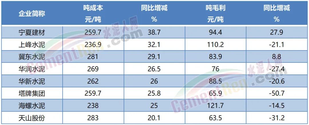 上半年煤、電成本持續(xù)高位導致水泥企業(yè)成本大幅上漲。上市公司噸成本數(shù)據(jù)中寧夏建材噸成本同比增加38.7%。