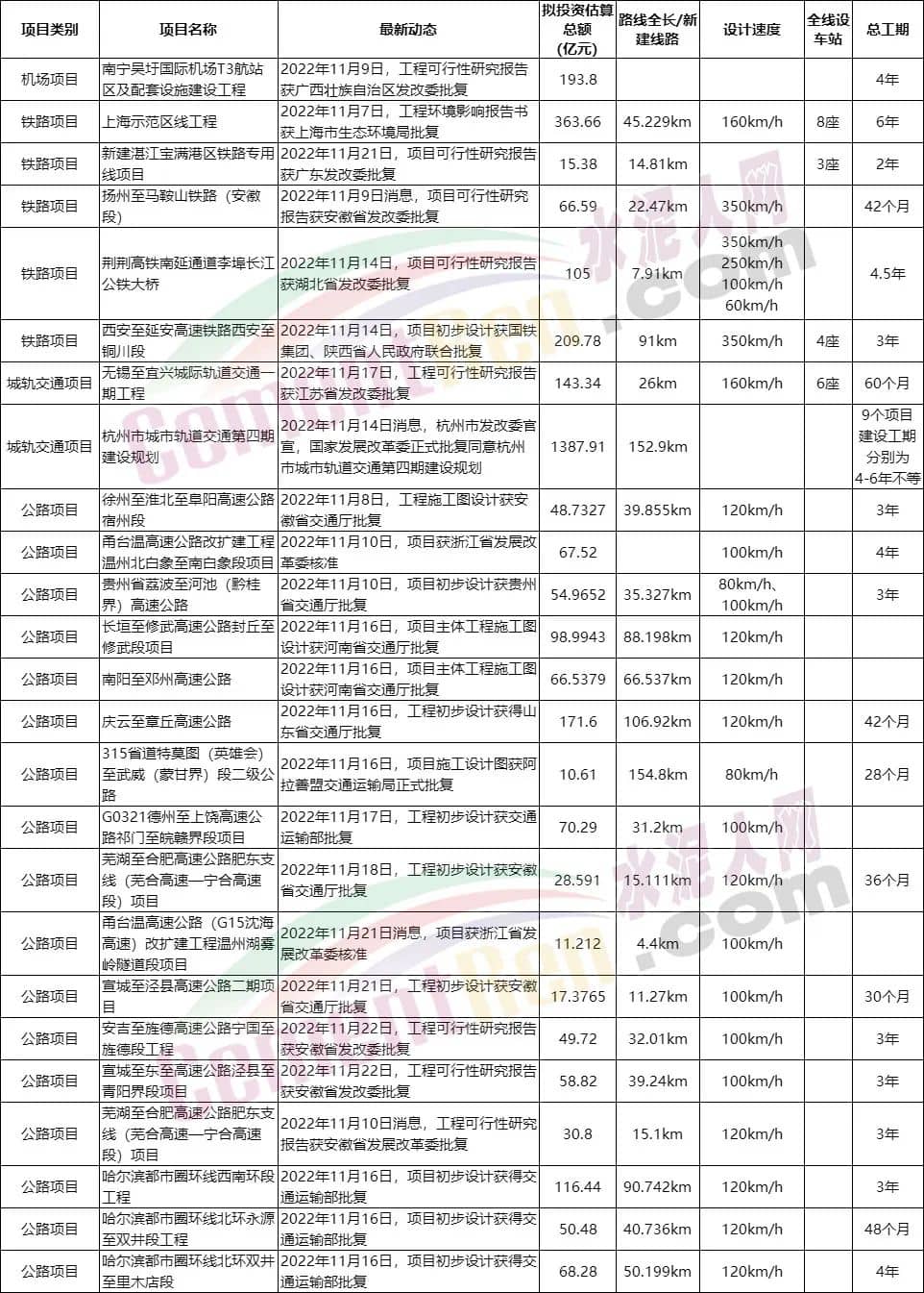 時至年末,涉及鐵路、公路、機場、城軌等重點項目獲批、開工。據水泥人網不完全統計,僅11月份就有25項重大鐵路、公路、城軌交通及機場項目環(huán)評報告、可研報告、施工圖設計、項目核準、初步設計獲得省/市發(fā)改委、生態(tài)環(huán)境局、交通廳等批復,項目總投資額近3500多億元。