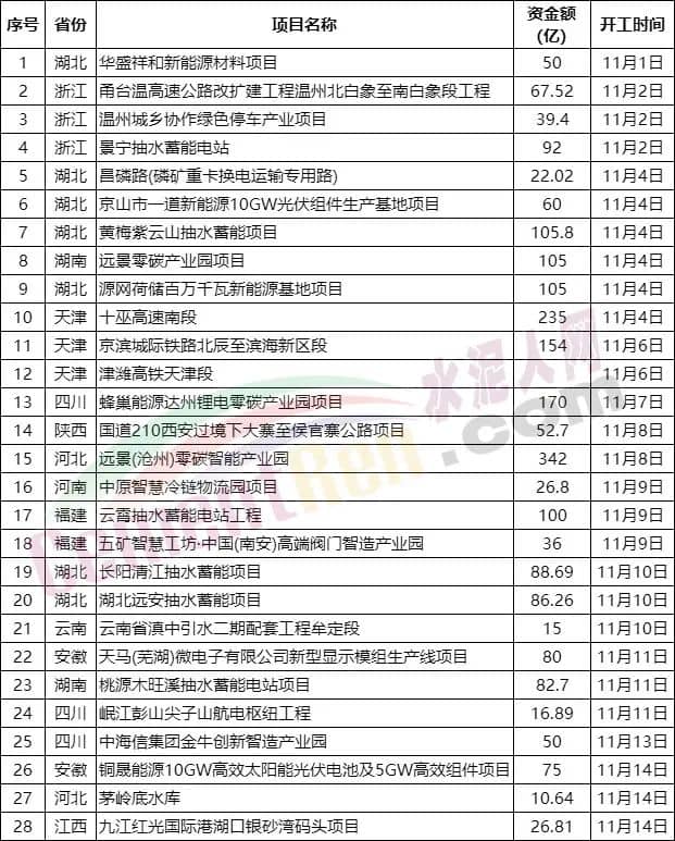 11月1日-11月15日,28個重大項目開工,總投資超2296億元。其中,公路3條,鐵路2條,共計總投資超509億元;蓄電站6個,總投資超555億元。