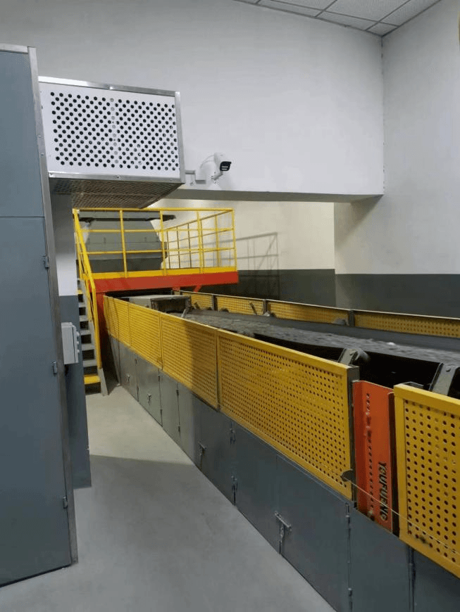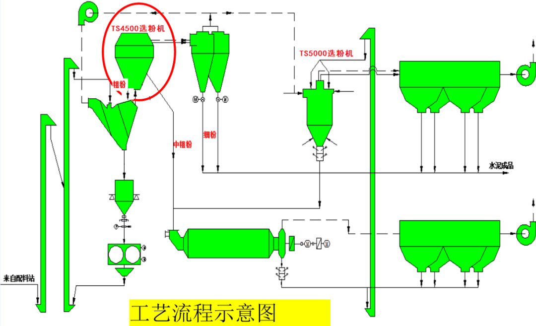 蘇州天山水泥生產(chǎn)工藝流程配置為4.2*13M管磨機(jī)+180*120輥壓機(jī)+TS4500雙轉(zhuǎn)籠選粉機(jī),首先將各原材料按照一定配比通過電子皮帶秤計(jì)量混合后送至配料提升機(jī),除鐵后進(jìn)入循環(huán)提升機(jī),提升至V型選粉機(jī)進(jìn)行選粉,粗顆粒回恒重倉緩沖后進(jìn)入輥壓機(jī)中碾壓,碾壓擠碎后通過循環(huán)提升機(jī)帶至V型選粉機(jī),V型選粉機(jī)粗選出的較細(xì)物料進(jìn)入TS4500選粉下轉(zhuǎn)籠初選,200um以上的顆粒通過下轉(zhuǎn)籠選粉后回恒重倉,小于200um的顆粒進(jìn)入TS4500選粉機(jī)上轉(zhuǎn)籠再次進(jìn)行選粉,合格品通過旋風(fēng)筒收集送入成品斜槽與磨機(jī)成品進(jìn)行混合,不合格品進(jìn)入球磨機(jī)進(jìn)行粉磨,球磨機(jī)粉磨后的物料通過出磨提升機(jī)提升至TS5000選粉機(jī)選粉,合格品通過系統(tǒng)風(fēng)機(jī)帶入收塵系統(tǒng)收集后進(jìn)入成品斜槽與TS4500成品混合,最終送入水泥庫作為水泥成品儲(chǔ)存,不合格品回球磨機(jī)進(jìn)行再次粉磨。