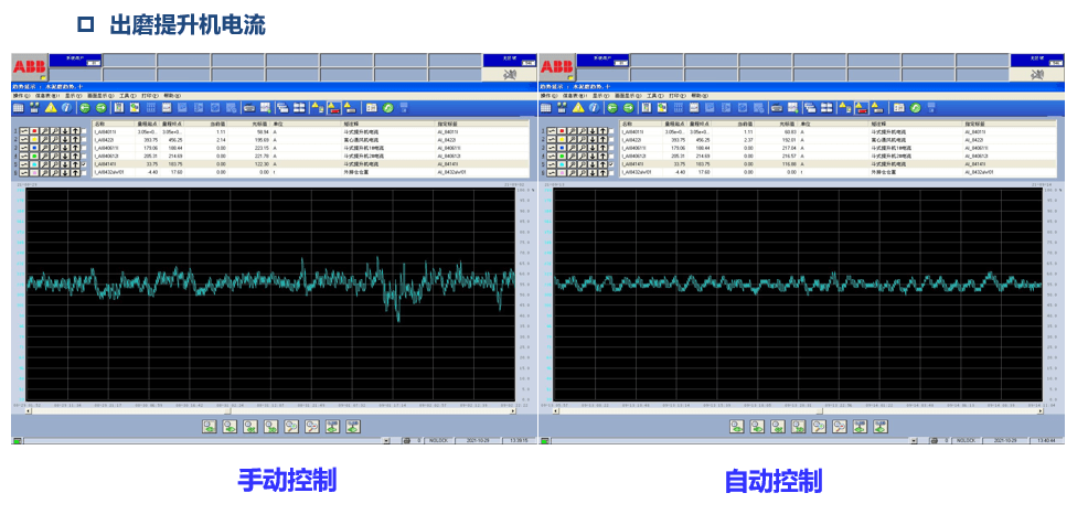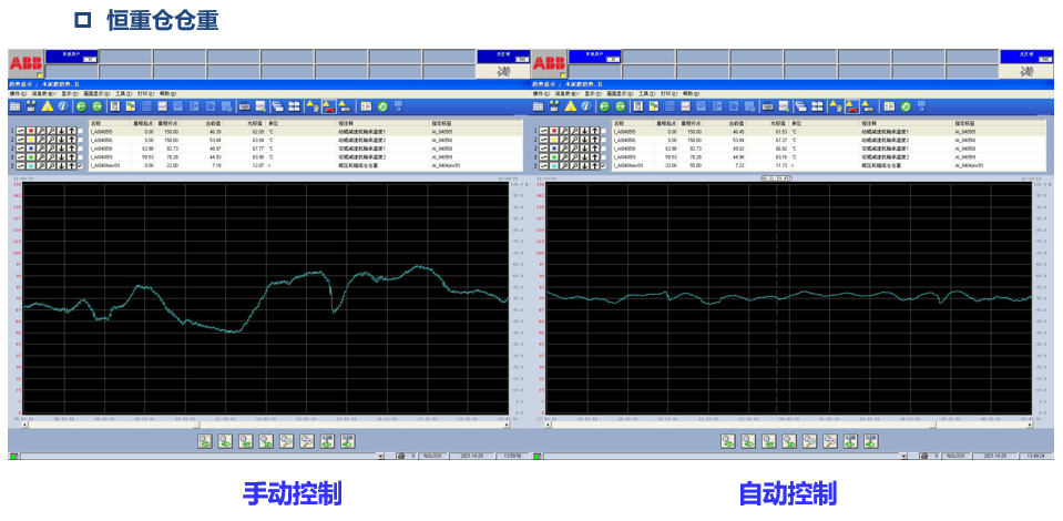 1、智能控制系統(tǒng)投運(yùn)至今,實(shí)現(xiàn)自控率大于95%,輥壓機(jī)循環(huán)系統(tǒng)和磨機(jī)系統(tǒng)始終保持平衡穩(wěn)定狀態(tài),各參數(shù)波動(dòng)幅度大幅度降低,水泥生產(chǎn)全智能、準(zhǔn)無人化運(yùn)行,可靠實(shí)現(xiàn)了生產(chǎn)過程的連續(xù)、平穩(wěn)運(yùn)行,下圖為恒重倉倉位和出磨提升機(jī)電流手動(dòng)控制和自動(dòng)控制趨勢對(duì)比圖。