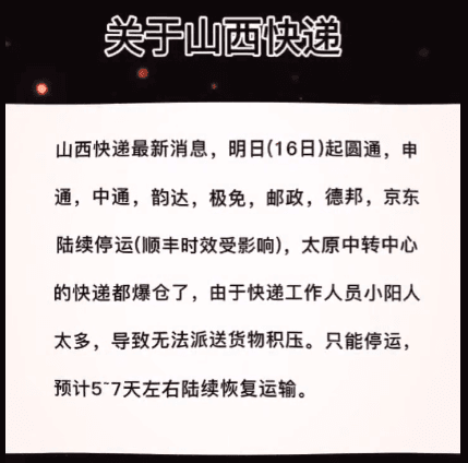 山西當(dāng)?shù)赝ㄖ?2月16日起,申通、圓通、中通、韻達(dá)、極兔快遞、郵政、德邦、京東等陸續(xù)停運(yùn)(順豐時(shí)效受影響),太原中轉(zhuǎn)中心快遞爆倉,無法派送,只能停運(yùn),預(yù)計(jì)5-7天左右陸續(xù)恢復(fù)運(yùn)輸。