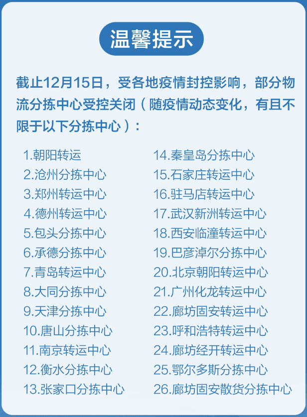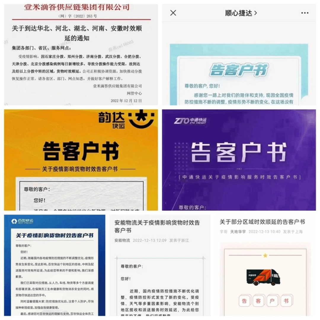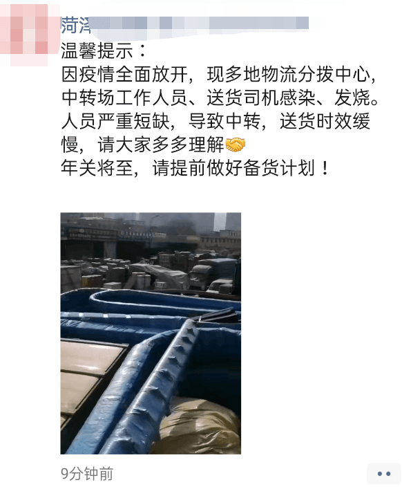 山東菏澤一企業(yè)溫馨提示稱:“因疫情全面放開,現(xiàn)多地物流分撥中心中轉(zhuǎn)場(chǎng)工作人員、送貨司機(jī)感染、發(fā)燒人員嚴(yán)重短缺,導(dǎo)致中轉(zhuǎn),送貨時(shí)效緩慢,請(qǐng)大家多多理解個(gè)年關(guān)將至,請(qǐng)?zhí)崆白龊脗湄浻?jì)劃!”