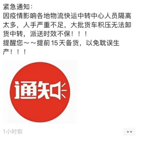 另一企業(yè)發(fā)緊急通知稱:“因疫情影響各地物流快運(yùn)中轉(zhuǎn)中心人員隔離太多,人手嚴(yán)重不足,大批貨車積壓無法卸貨中轉(zhuǎn),派送時(shí)效不保!!!提醒您:提前15天備貨,以免耽誤生產(chǎn)!”