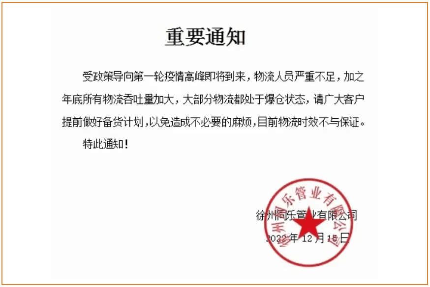 徐州同樂管業(yè)重要通知:“受政策導(dǎo)向第一輪疫情高峰即將到來,物流人員嚴(yán)重不足,加之年底所有物流吞吐量加大,大部分物流都處于爆倉狀態(tài),請(qǐng)廣大客戶提前做好備貨計(jì)劃,以免造成不必要的麻煩,目前物流時(shí)效不保證。”