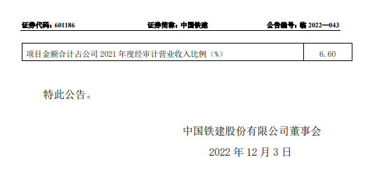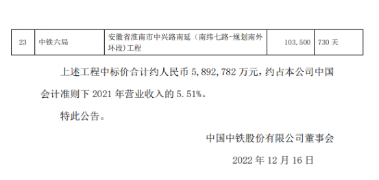中國中鐵中標(biāo)價(jià)合計(jì)約人民幣589億元,約占公司2021年?duì)I業(yè)收入的5.51%。