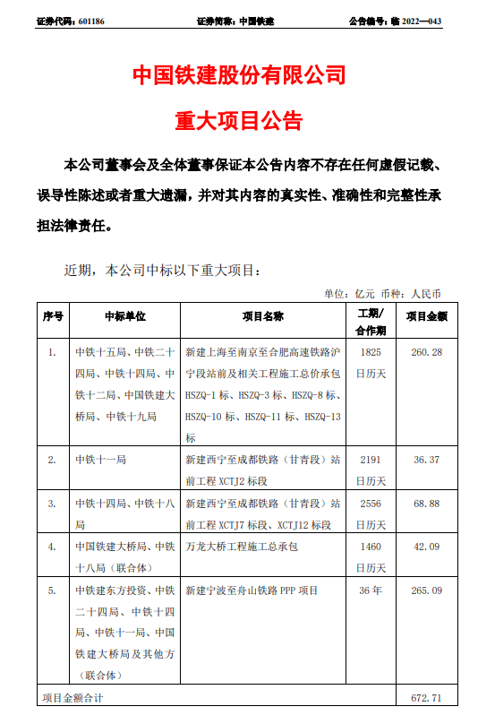 中國鐵建發(fā)布重大項(xiàng)目公告稱,已中標(biāo)合計(jì)672億重大項(xiàng)目。
