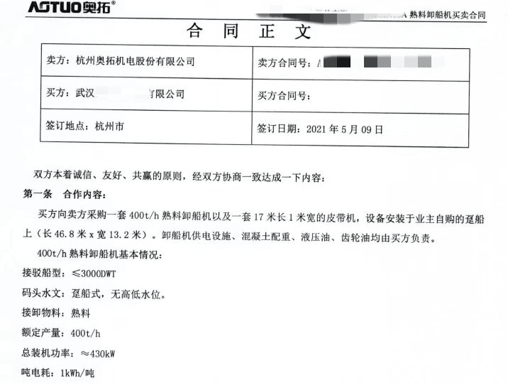 該企業(yè)負(fù)責(zé)人對水泥人網(wǎng)表示,2021年,他們從杭州奧拓機(jī)電股份有限公司(以下簡稱“奧拓股份”)采購了一套環(huán)保熟料卸船機(jī)和一套皮帶輸送機(jī),卸船機(jī)額定生產(chǎn)率400噸/小時,據(jù)悉該類型熟料卸船機(jī)最大生產(chǎn)率可達(dá)1500噸/小時,最大可卸載10萬噸級散貨船。