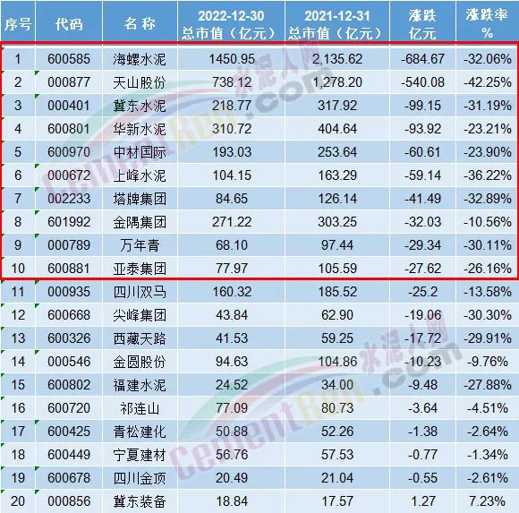 從水泥行業(yè)A股20家主流上市公司來看,市值蒸發(fā)達(dá)一千多億。